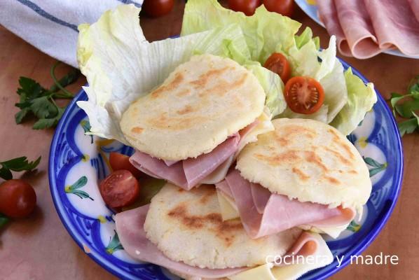 Y así es la forma de como hacer arepas de forma sencilla; tan solo nos queda rellenarlas a nuestro gusto. Abrirlas por la mitad con un cuchillo de sierra y echarle el relleno, en este caso jamón cocido y queso. Y a comer.