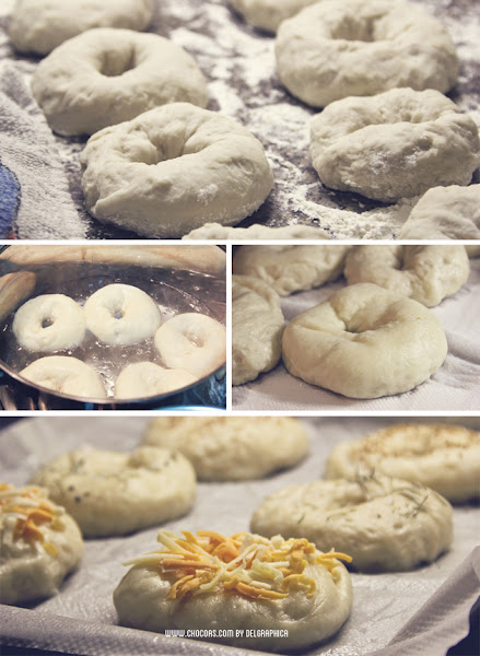 (Ahora viene la parte guay, ya veréis) En un olla hervir 2 litros de agua con 2 cucharadas soperas de azúcar. Cuando empiece a hervir, echar los bagels y hervir unos 4 minutos, 2 minutos, voltear, 2 minutos más, sacar y dejar secar encima de un papel absorbente. Hervir los bagels de 4 en 4, o los que os quepan en la olla. Veréis que los bagels al hervir se hinchan un poquito.