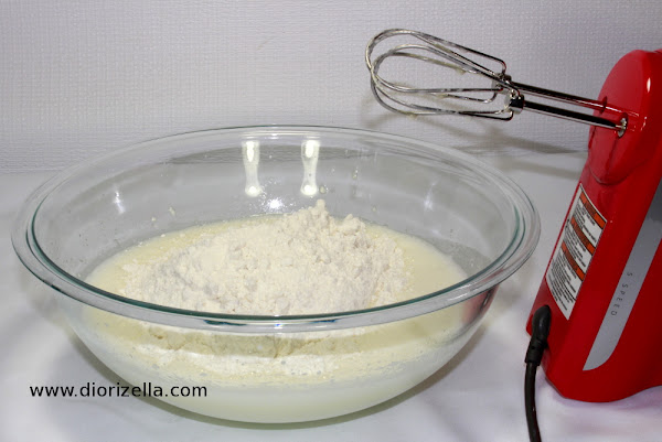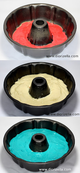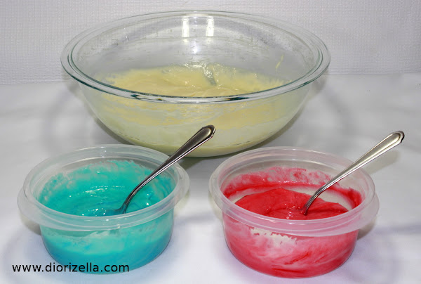 8. Coloca la mezcla de Bizcocho color blanca sobre la mezcla roja. www.diorizella.com