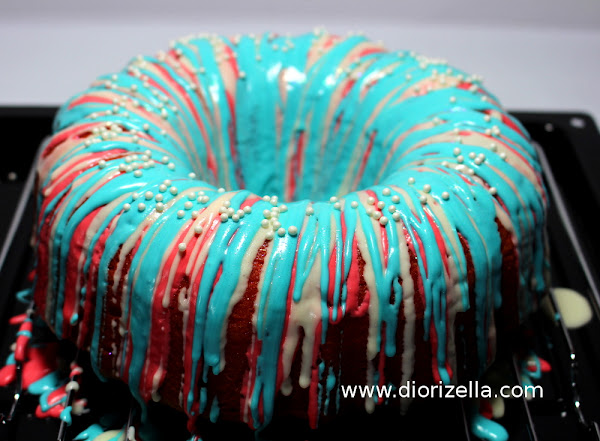 Coloca el frosting color rojo en el microondas por 15 segundos y vierte lo en lineas finas sobre el Bizcocho. Recuerda colocar el Bizcocho sobre una bandeja con una rejilla. Repite lo mismo con los demás colores. Finalmente decora el Bizcocho con glitter comestible y perlitas.