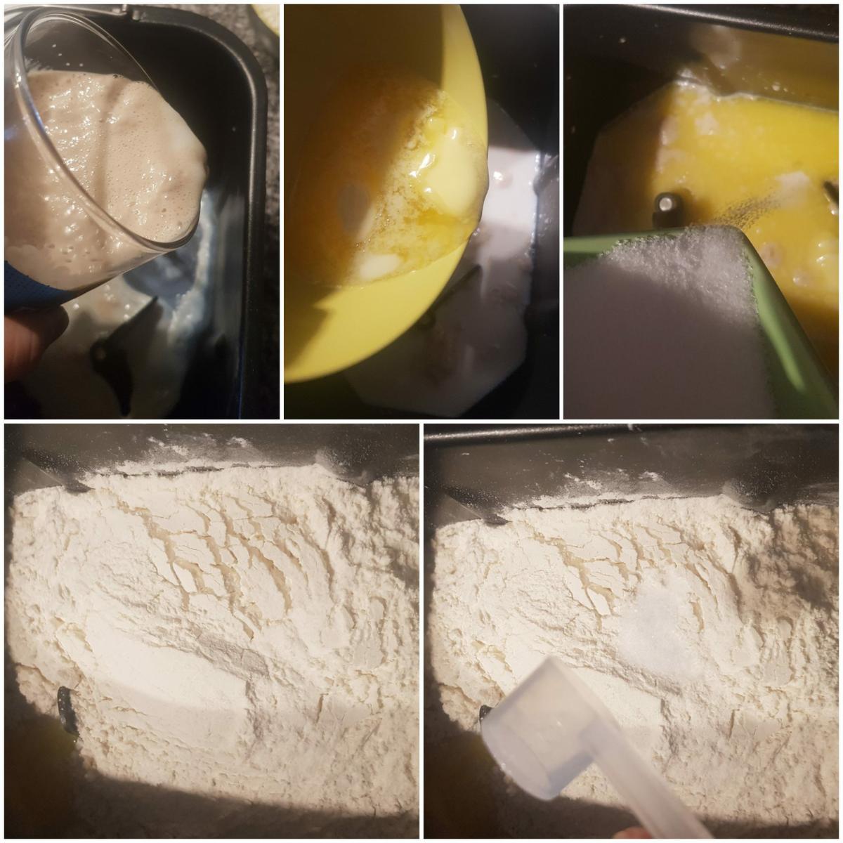 Derretimos la mantequilla Mientras dejamos actuar la leche con la levadura, derretimos la mantequilla. Una vez derretida la mantequilla, añadimos en un bol o en mi caso en la cubeta de la panificadora, la leche con la levadura que ya habrá empezado a actuar y la mantequilla, seguidamente le añadimos el azúcar, la harina y por último la sal.