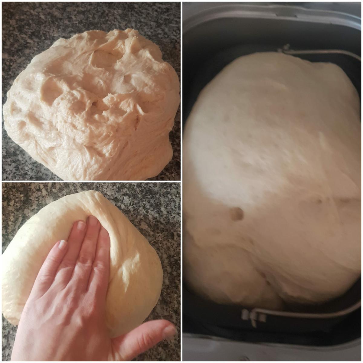 Personalmente la masa la he realizado con la panificadora, que ahorra mucho trabajo sobre todo con el tema de tiempos de levado, pero se puede amasar en amasadora también o mano, y luego dejar levar la masa con un paño hasta que doble su volumen.