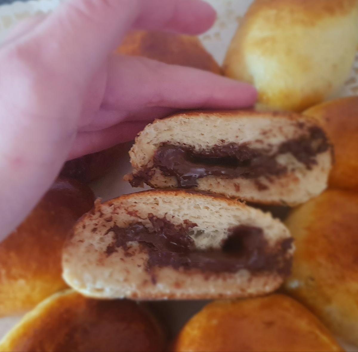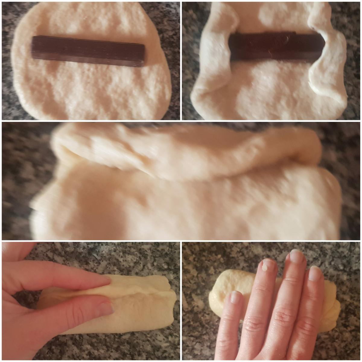 Rellenar la masa Cogemos una porción de masa y la aplastamos con las manos, haciendo una tortita. En el centro añadimos el trozo de chocolate o la crema de cacao y envolvemos suavemente, pellizcando los dobletes de la masa para que no se nos salga el relleno en el horneado. (ver imagen)