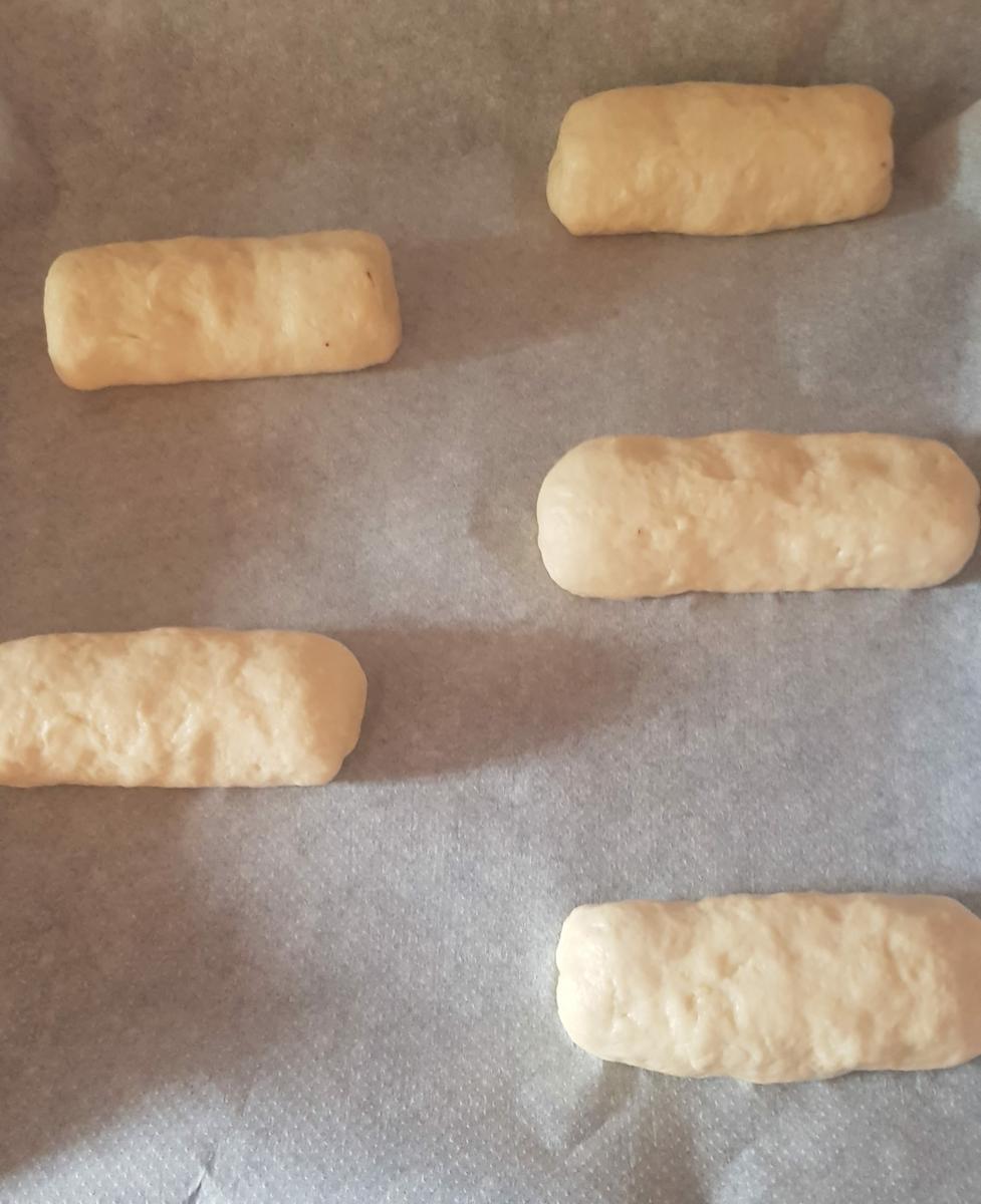 Levado Hacemos lo mismo con todas las porciones de masa, y vamos dejando nuestros bollycaos, en una bandeja con papel de horno, cuando los tengamos todos, tapamos con papel film o un trapo y los dejamos levar otra vez, hasta que dupliquen su volumen, más o menos entre 30/45 minutos.