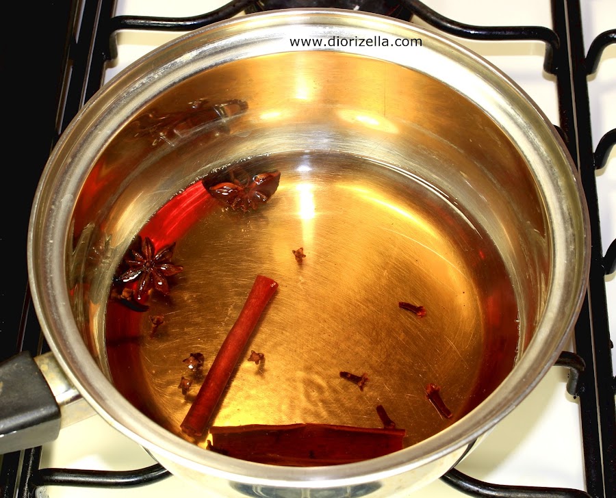Lo primero que vas a hacer es preparar el caldo de especias. En una cacerola coloca agua y agrega canela en rama, anís estrellado y clavos aromáticos. Deja el agua hervir por varios minutos hasta que cambie de color. Retira de la estufa y deja enfriar. Luego con la ayuda de un colador retira las especias. Saca aparte media taza aproximadamente del caldo de especias para usarlo luego.