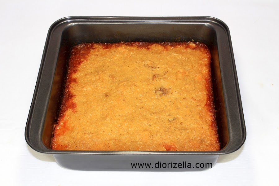 8. Coloca el molde a baño de maría (recipiente con agua). Hornea a 350 F por 45 minutos a una hora. Deja enfriar el budín de pan y desmóldalo en un plato. Sírvelo a temperatura ambiente o frío de nevera según tu preferencia. www.diorizella.com
