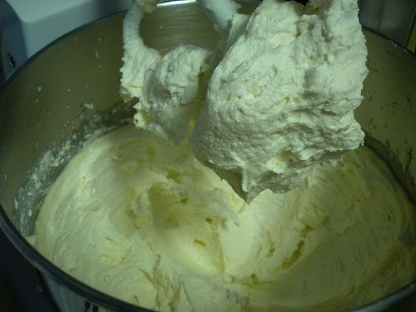 Metemos en el bol la mitad del azúcar glass y toda la mantequilla y mezclamos a velocidad baja un minuto aproximadamente, cuando vemos que se ha integrado la primera mitad añadimos el resto del azúcar y seguimos mezclando hasta que se homogeiniza la mezcla.