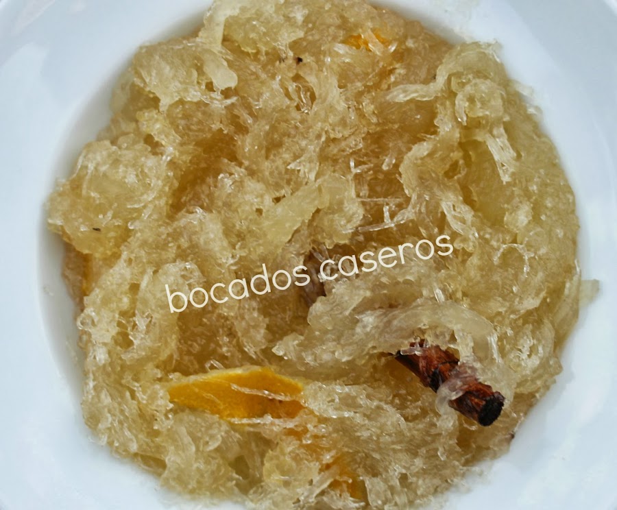 6. Metemos el cabello de ángel mientras este caliente, en un frasco de cristal esterilizado, tapamos bien y dejamos envuelto en un paño boca abajo para que haga vacío y así conservar hasta que lo utilicemos.