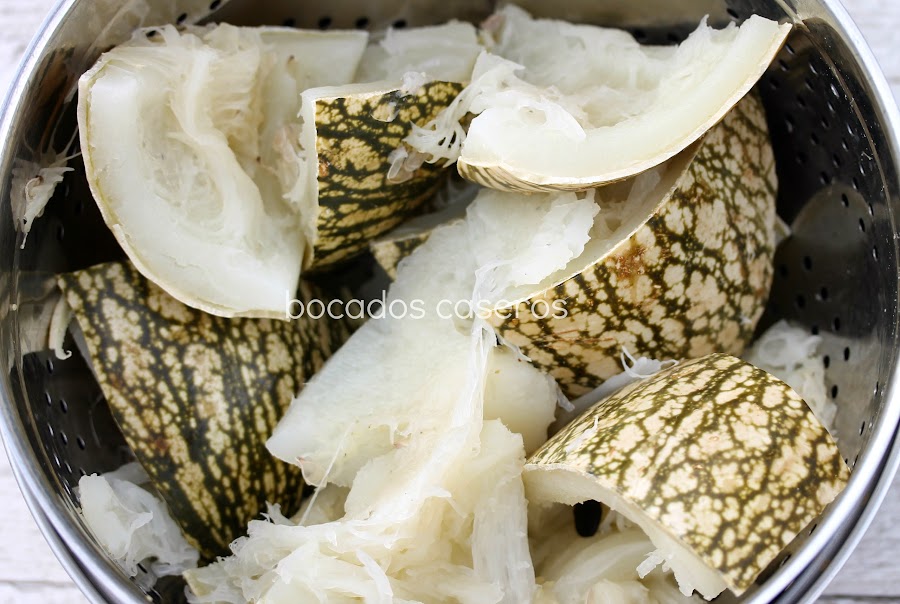 3. Cuando la tengamos ya con menos temperatura, empezamos a limpiar, separamos y retiramos la corteza, limpiamos bien de pepitas y empezamos a deshilachar la carne haciendo hebras con la pulpa, volvemos a escurrir bien apretando la carne.