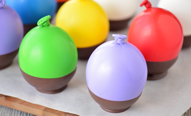 También puedes hacer otra versión. Realiza lo mismo con el globo, solo que esta vez no dejes caer el chocolate por encima. Ahora lleva directamente el globo al molde del chocolate fundido (a la mitad), escurre el exceso y colócalo sobre una fuente con papel encerado. Lleva a la nevera y espera unos minutos