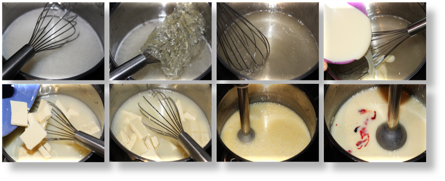 Añade a un cazo el azúcar, los 150 ml. de agua y la glucosa. Lleva a ebullición a fuego medio. No dejes de remover con ayuda de unas varillas.