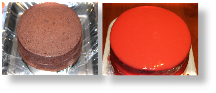Y por último, ya podrás verter sobre el bizcocho la cobertura espejo uniformemente.