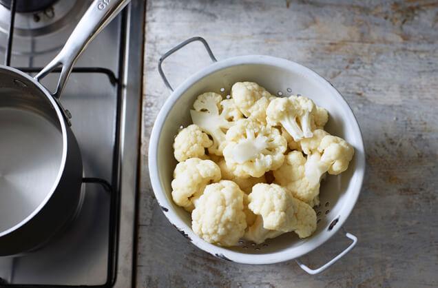 Precaliente el horno a 200 ° C, ventilador 180 ° C. Llene la mitad de una cacerola grande con agua y póngala a fuego medio-alto hasta que hierva. Retire las hojas exteriores de 1 coliflor, luego corte el resto en flores, divida la coliflor en pedazos para que todas tengan un tamaño uniforme. El tallo y las hojas sobrantes se pueden cortar y cocinar en salteados, ¡así que no los desechen!