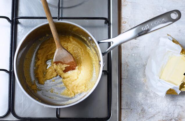Derrita suavemente 40 g de mantequilla en una sartén a fuego lento, luego agregue 50 g de harina. Cocine, sin dejar de remover unos segundos, hasta que forme una pasta suave y espesa.