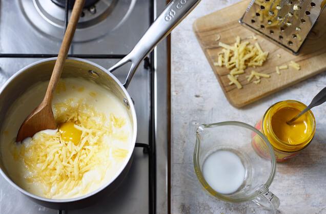 Primero medir 450 ml de leche. Después vierta un poco en la sartén y revuelva hasta que quede suave. Continúe agregando la leche, poco a poco, revolviendo hasta que esté completamente mezclada. Cocine suavemente durante otros 2 minutos, revolviendo para que no pegue. Añada 80 g de queso cheddar, rallado y 1 cucharadita de mostaza inglesa y revuelva hasta que se derrita en la salsa. Sazonar y retirar del fuego.
