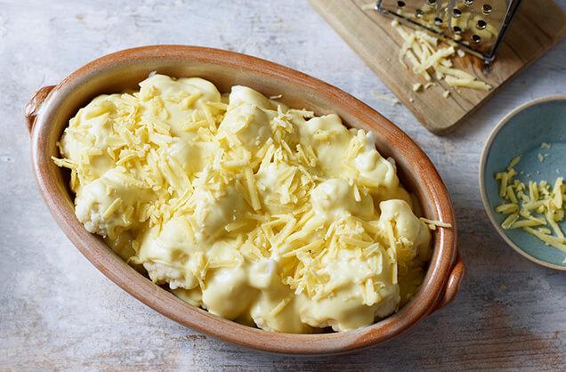 Vierta un poco de la salsa de queso en un plato hondo para horno. Agregue la coliflor, luego vierta sobre el resto de la salsa para cubrir completamente. Ralle un poco de Cheddar por encima de la coliflor, luego colóquelo en una bandeja para hornear. Hornear por unos 20 minutos y servir.