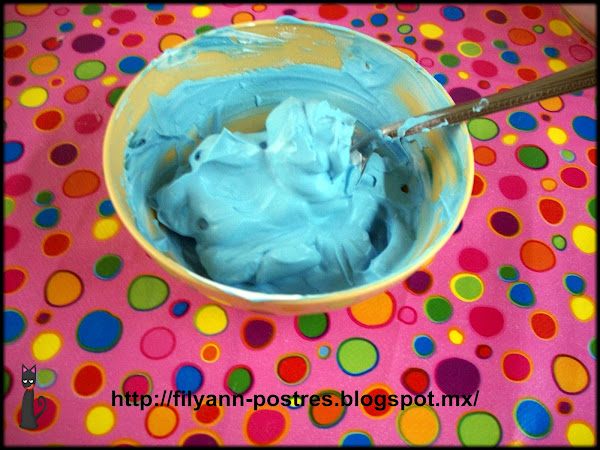 5.- Una vez que ya este batida, si lo queremos la podemos pintar de diferentes colores, solo hay que agregar unas gotas de colorantes vegetales e ir integrando suavemente hasta que la crema tome el color deseado.