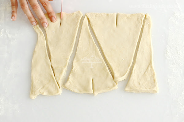 Cortaremos la masa con forma de rectángulo y a su vez volveremos a cortar triángulos más altos que anchos, haremos un corte en la base de los triángulos y enrollaremos, curvándolos para darles forma de croissants.