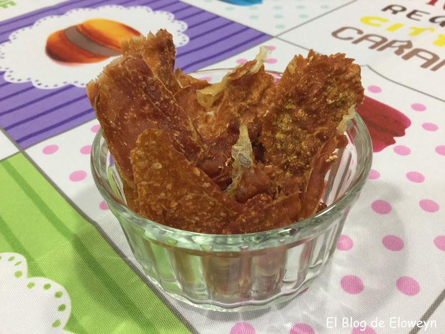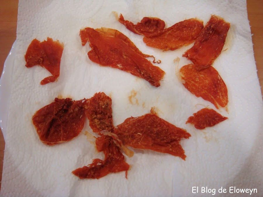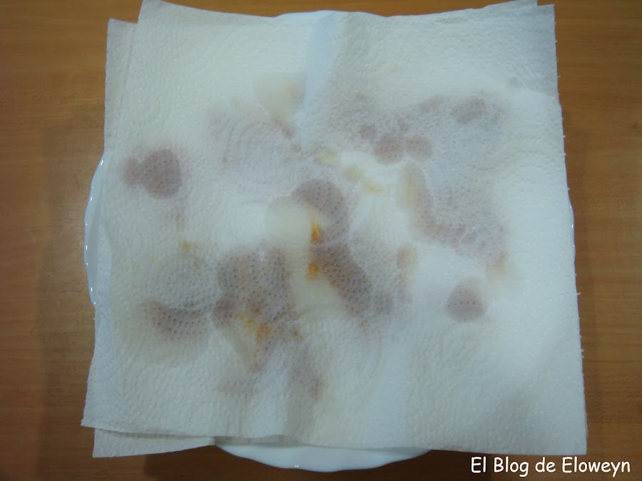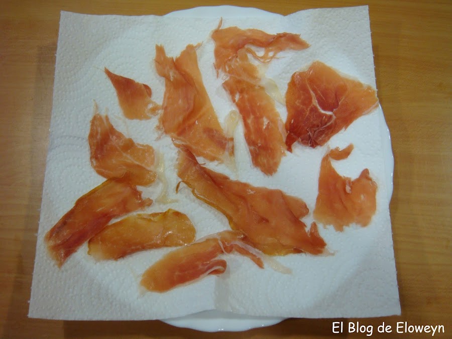 Como podéis ver, el papel ha absorbido la grasa que ha soltado el jamón. Quitamos el papel de encima y...¡Aquí tenemos el crujiente de jamón!