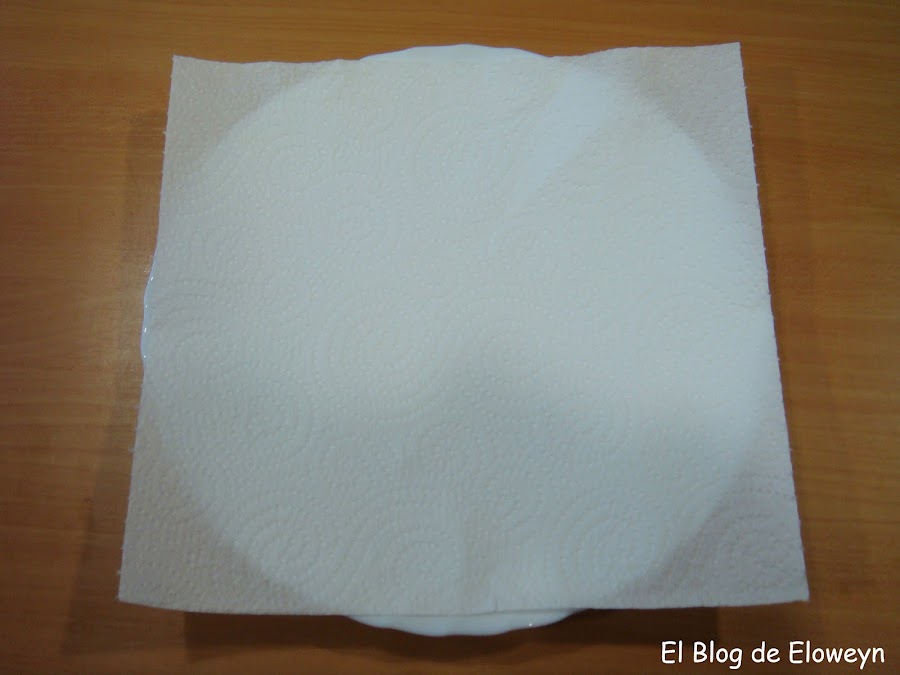 Para hacer el crujiente de jamón pondremos en un plato un trozo de papel de cocina. Se puede hacer sin plato, si queréis, pero es más higiénico poniendo un plato, ya que después os ahorraréis de limpiar el microondas.