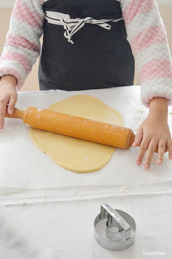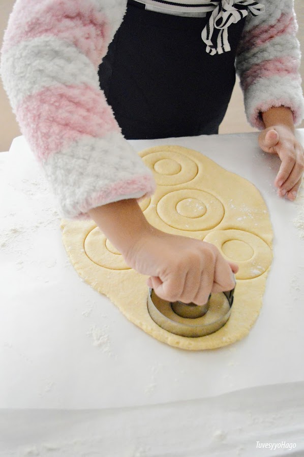 5. Con un cortador de rosquillas, corta la masa. El que yo tengo es de +IBILI MENAJE , pero si no tenéis cortador solo tenéis que utilizar dos vasos de dos tamaños diferentes.