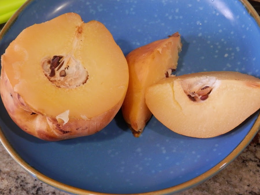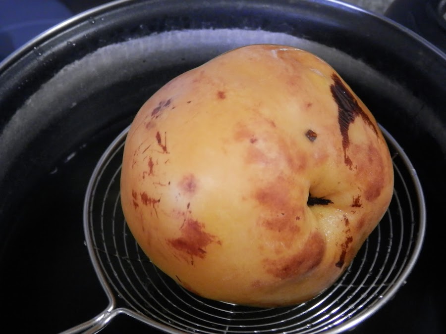 Ahora limpia de piel y pepitas el membrillo y pesa la carne de membrillo limpio. Nos da un peso de 356 gr.