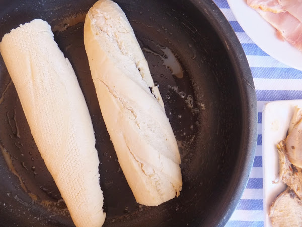 7. Corta el pan por la mitad y tuesta el interior en la plancha o sartén.