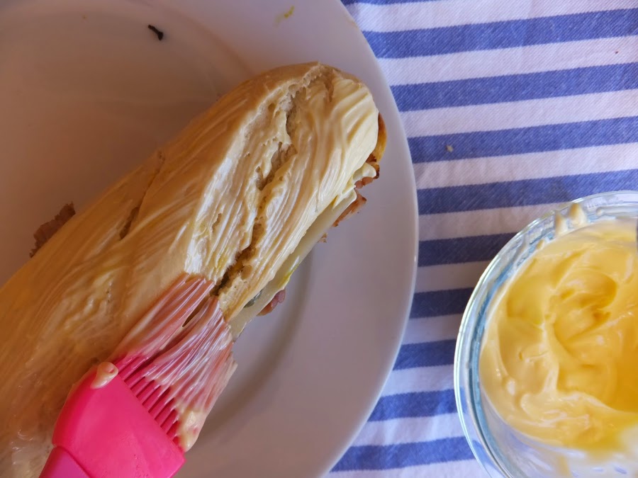 8. Unta el interior de una de las tapas de pan con mostaza y coloca el resto de ingredientes: 2 láminas de jamón, 3 de cerdo, 2 de queso y 2 láminas grandes o 3 pequeñas de pepinillo. Cierra el sándwich y pincela el exterior con mantequilla derretida.