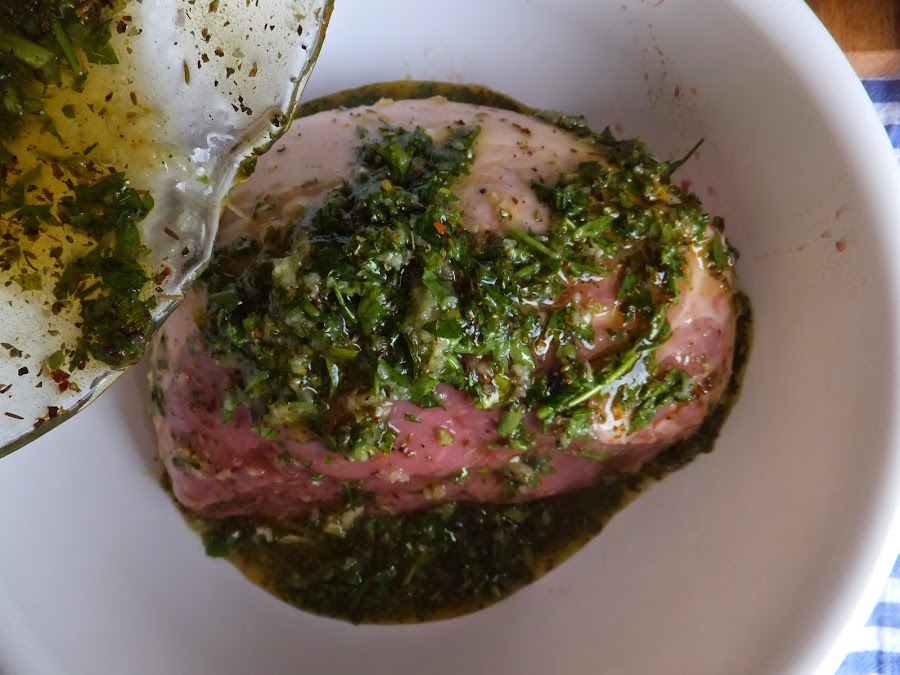 2. Coloca el cerdo en un bol o bandeja y echa el mojo sobre el. Haz unos cortes en la superficie y masajea el cerdo y muevelo para que se impregne bien con el mojo. Mete el cerdo y el mojo en una bolsa hermética y deja marinar en la nevera de 12 a 24 horas. (Remueve de vez en cuando durante el proceso).