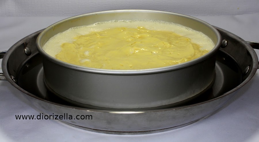 Paso 7: Colocar en el horno pre calentado a 350 F en baño de maría por 45-50 minutos o hasta que un palito salga limpio.