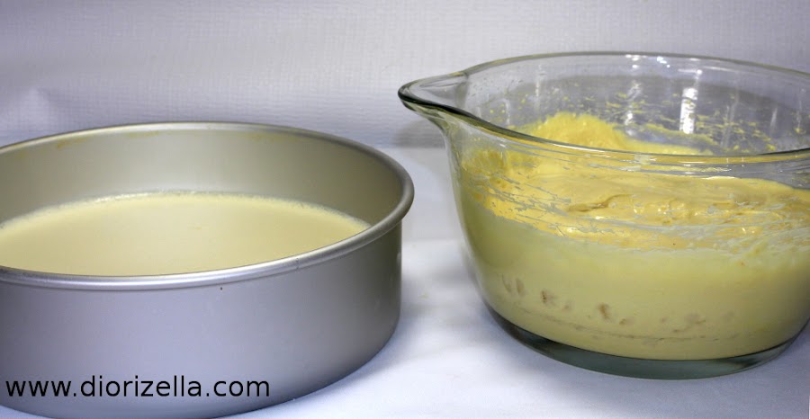 Paso 6: Colocar la mezcla del bizcocho en el molde, sobre la mezcla del flan.