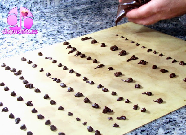 Volvemos a calentar el chocolate, si fuera necesario, en el microondas, y hacemos de nuevo más gotitas sobre la lámina.
