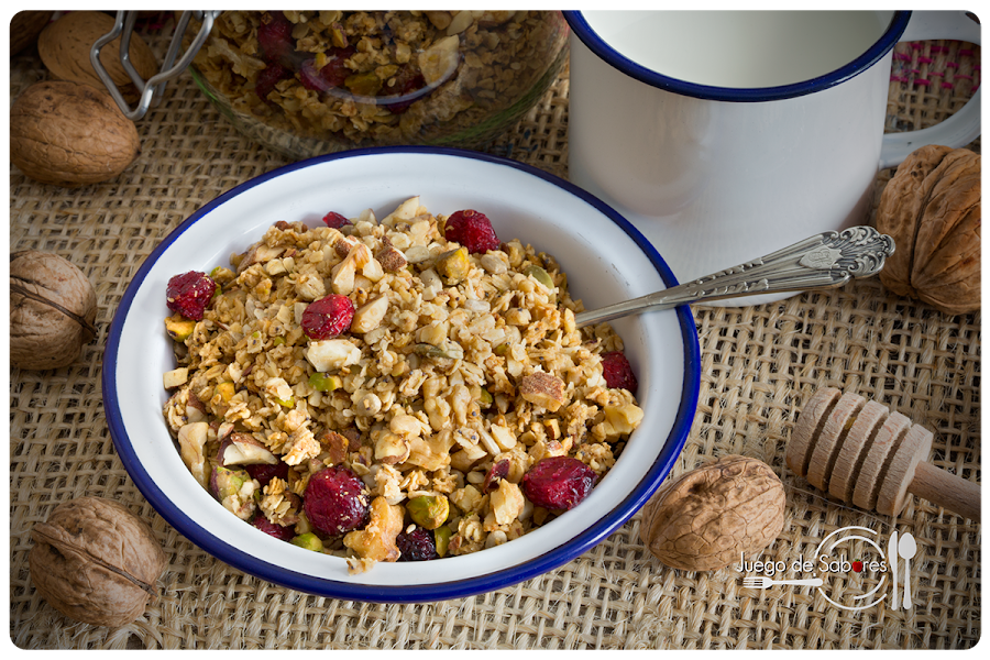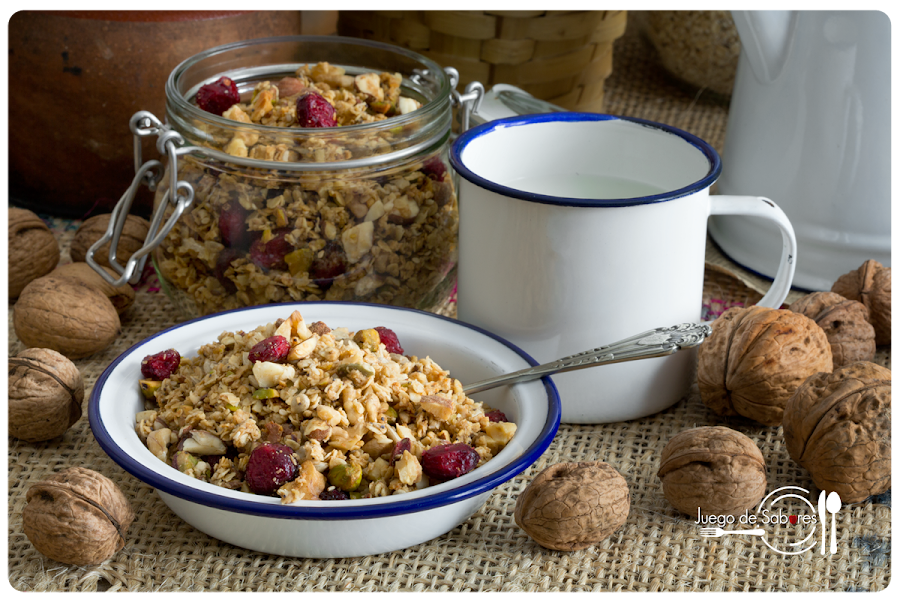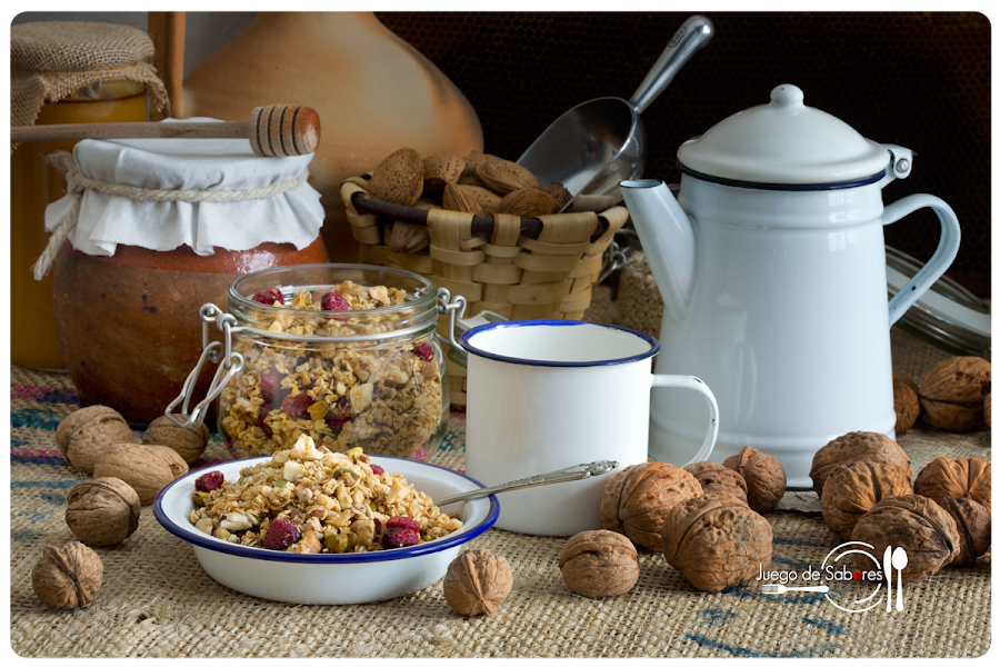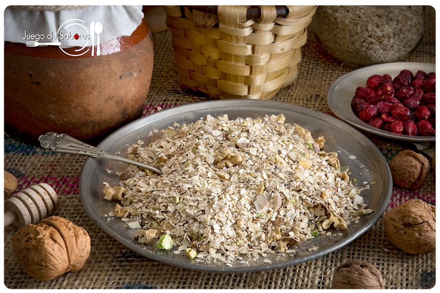 Hicimos esta receta porque en invierno, cuando las frutas no son tan apetecibles, nos gusta cenar de postre yogourt con granola. Desde que hemos ido reduciendo el azúcar en nuestra dieta, las granolas que comprábamos nos resultaban excesivamente dulces así que optamos por hacerla en casa, lo que permite poner los frutos secos que más nos gustan y las frutas deshidratadas que más apetezcan. Además cada vez que la haces puedes variar la receta. O sea que no te repites. El ingrediente que siempre ha de estar presente es la avena, acompañada de frutos secos. A partir de ahí, la imaginación es libre. La próxima vez pondremos coco deshidratado y pepitas de chocolate. En casa ya se relamen.