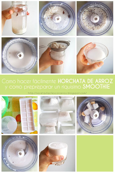 Si quieren hacer el smoothie entonces deben volcar parte de la horchata de arroz en una cubetera para así hacer cubitos de horchata como se ve en el foto-tutorial (fotos 7 y 8).
