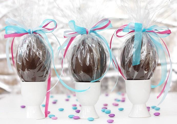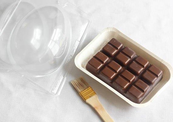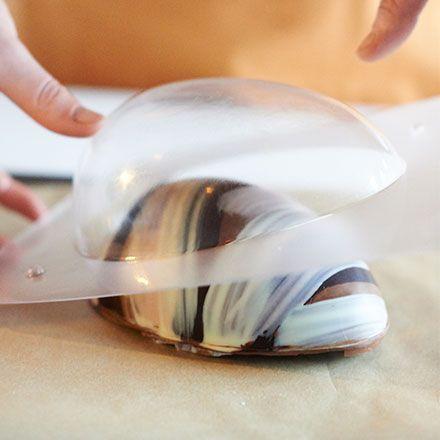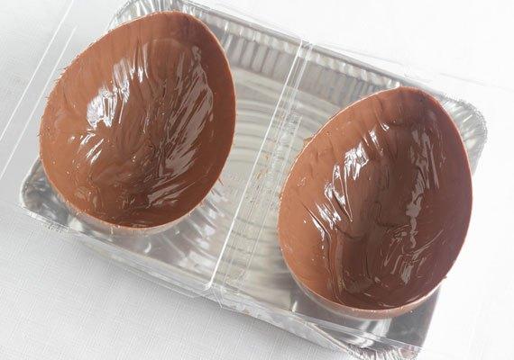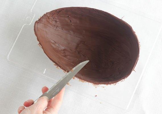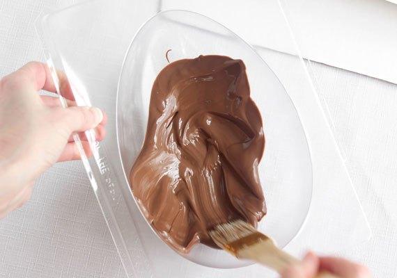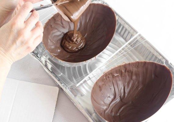 Apoyar cada mitad con la concavidad hacia abajo sobre un bowl o cazuela y con una manga cargada con el chocolate del mismo color que el cascarón, colocar sobre el borde, todo alrededor, en cada mitad. Rápidamente apoyar y unir las dos mitades y dejar secar antes de decorar.