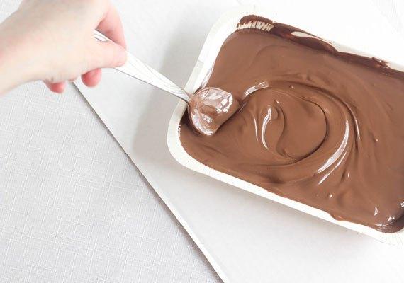 Una vez cubierto, se golpea un poco sobre la mesa para asentarlo más y quede más brillante, esperar a que el chocolate se opaque y repetir hasta obtener el grosor deseado (entre dos y tres manos serán suficientes).
