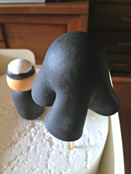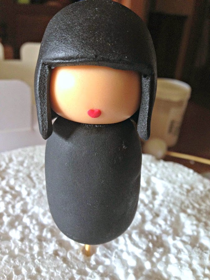 Tras hacer mi pedido de papel de azucar que siempre llega en perfecto estado y tiempo record, gracias Irene, lo primero es modelar el cuerpo, pondremos al fondant que usemos CMC para que endurezca antes, en este caso cogemos un trozo negro y le damos la forma del cuerpo de las muñecas.