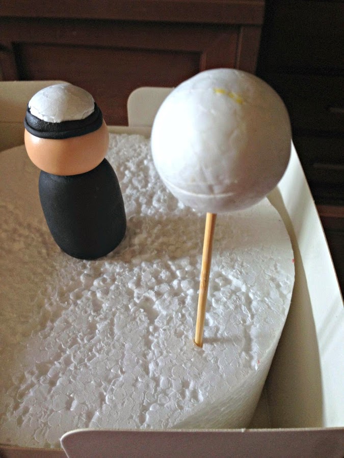 Pinchamos una bola de corcho en un palito para que nos haga de maniquí para hacer el pelo de la muñeca.