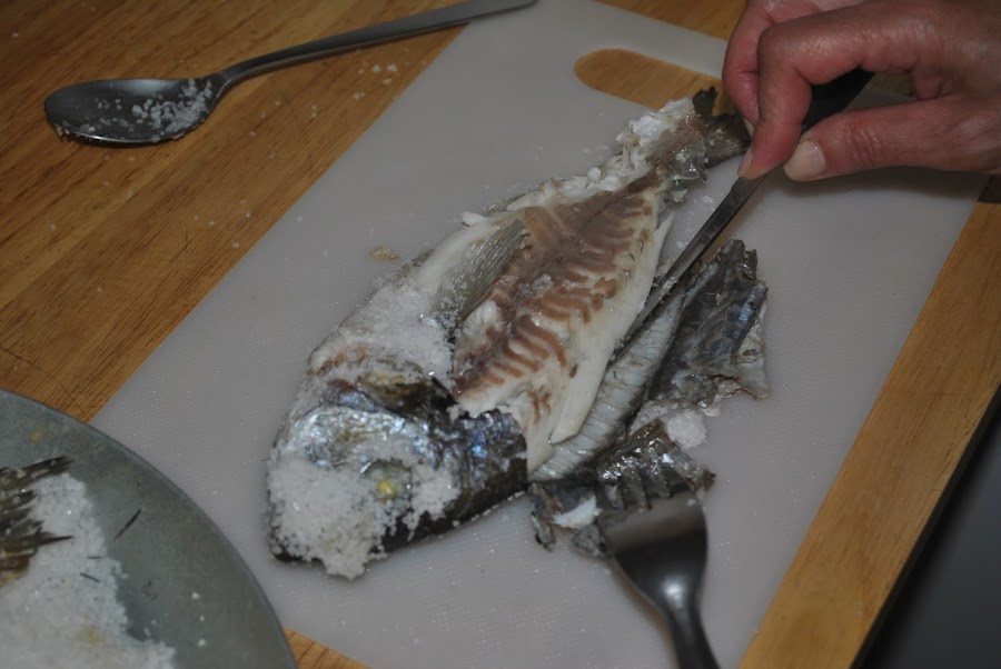 Terminado el tiempo de horneado, retiramos el pescado y le quitamos la capa de sal cuanto antes, para que no siga haciéndose dentro de la costra. Con la ayuda de un cuchillo la vamos cascando, veréis que sale con mucha facilidad.