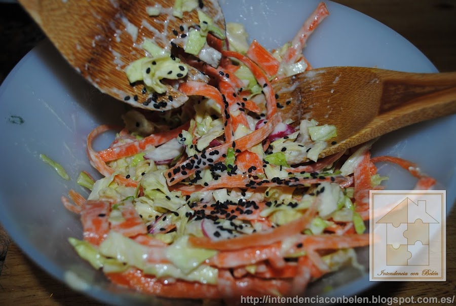 Escurrimos bien las verduras y añadimos la salsa. Ya sólo queda remover bien y poner unas semillas de sésamo, o amapola o incluso unos pistachos picados, lo quedo a vuestra elección.
