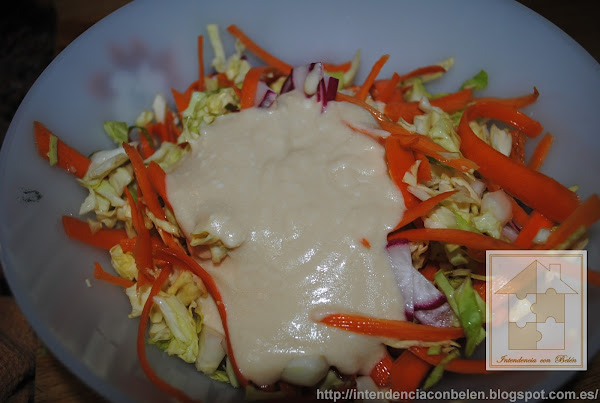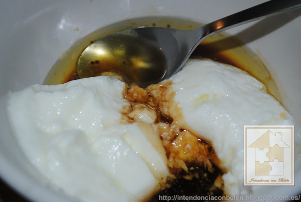 En un bol mezclamos el yogur, vinagre, aceite y soja. Y batimos bien.