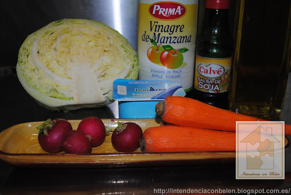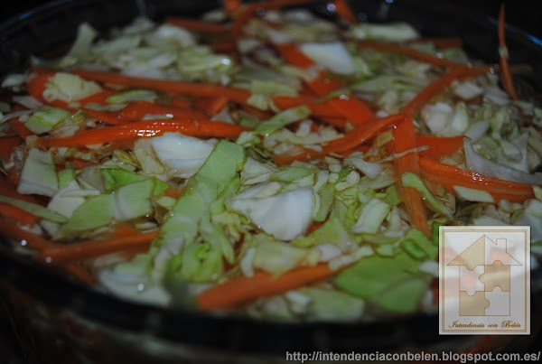Ponemos estos ingredientes en un bol con un puñadito de sal y dejamos unos 15 minutos. Vamos apretando las verduras para que vayan soltando el agua y luego escurrimos bien.