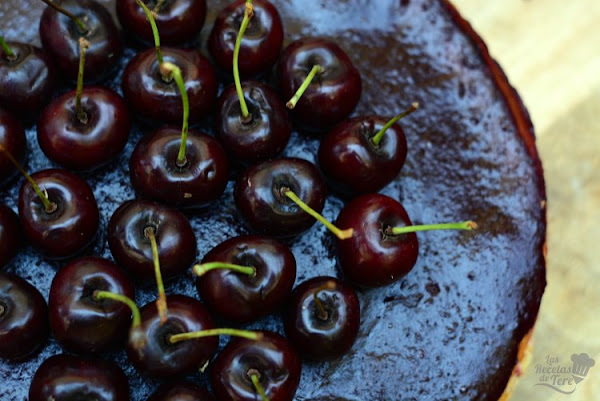 Ahora ya esta lista para montarla, esparce la mermelada sobre la tarta que ya debe haber enfriado, adorna con las cerezas con su tallo y mete en la nevera, el resultado es todo un espectáculo visual y para el paladar!!. Puedes servirla el mismo día o dejarla en la nevera de un día para otro todavía mejor.