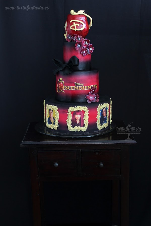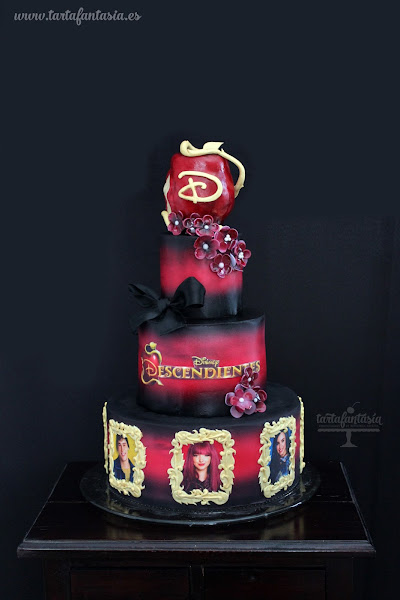 La semana pasada publiqué dos veces tutoriales relacionados con esta tarta fondant de Los Descendientes, os enseñé a hacer la manzana y un sencillo truco para que tuviera un bonito brillo, esta última técnica podréis aplicarla en vuestras tartas fondant y figuras también hechas con cualquier pasta de azúcar.