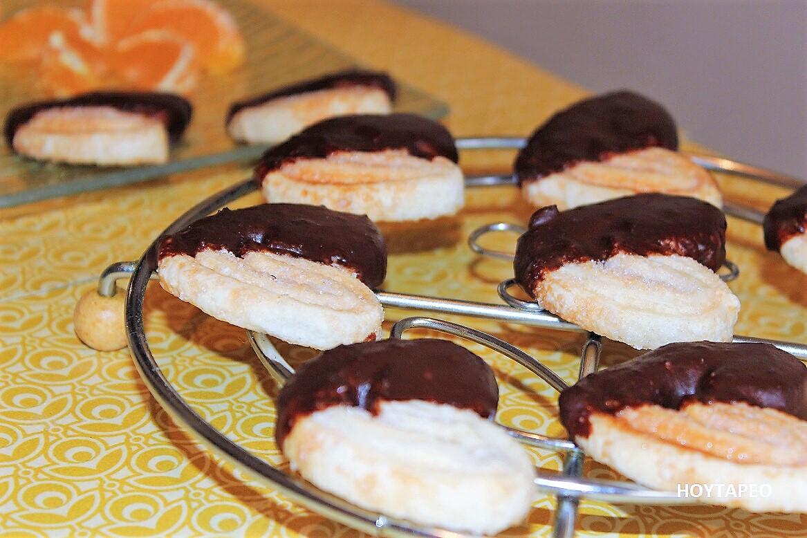 Por último, procederemos a cubrir, total o parcialmente, nuestras palmeritas con la cobertura de chocolate que hemos preparado y las volveremos a colocar sobre la rejilla, dejándolas escurrir. Así eliminaremos el exceso de chocolate.