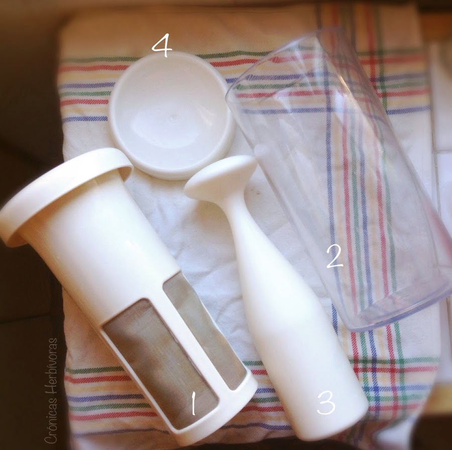 Chufamix se compone de 1: el vaso filtrante, 2: el recipiente 3: el mortero o émbolo 4: la tapa.