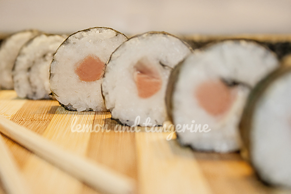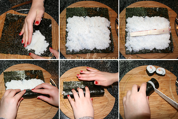 Empezamos presentando el alga en la tabla, nos mojamos las manos en el cuenco y empezamos cogiendo puñaditos de arroz que vamos extendiendo por toda la superficie del alga, dejando unas dos rayitas en el extremo (o unos cinco centímetros). Es mejor poner una capa gordita muy compacta para que se corte mejor y quede un aspecto más bonito, para ello aplastamos muy bien el arroz contra el alga e intentamos que no se vea el alga a través del arroz. Colocamos el relleno a unos 3/4, no en la mitad, y plegamos el extremo del alga cubriendo totalmente el relleno, asegurándonos de que estamos apretando bien y que no queda flojo. Continuamos enrollando hasta llegar al final, que mojamos con un poco de agua con los dedos y sellamos cerrando el rollo por completo. En este punto yo lo giro un poco sobre la tabla para asegurarme de que el borde se queda bien pegado, y para que se quede más redondito. No os paséis con el agua del cierre porque si no el alga se encoge y no conseguís nada.