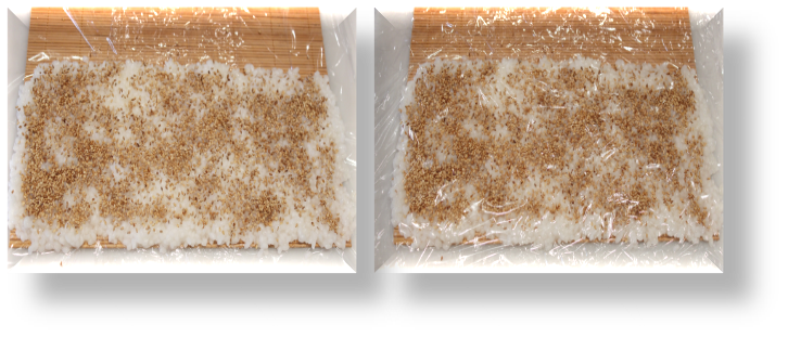 Si quieres poner sésamo tostado en el lado externo del maki sushi, incorpóralo sobre el arroz.