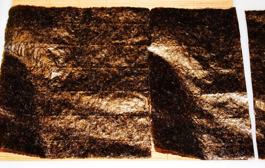 Coloca sobre la esterilla el alga. La cara rugosa debe quedar hacia arriba y la brillante hacia abajo. Recorta para que quede ajustado al tamaño de la esterilla.
