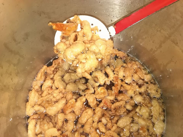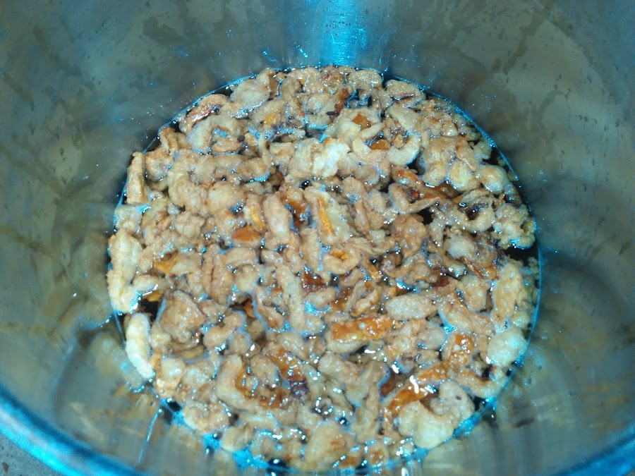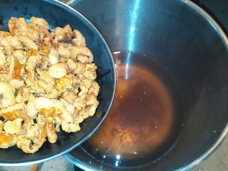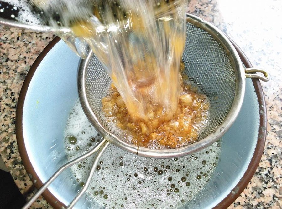 Con ayuda de una espumadera sacamos los griñispos, quedando así la grasa obtenida en la cacerola